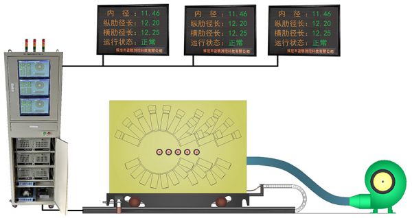 主控室液晶顯示器:管材截面的最大/最小直徑、平均值、橢圓度;各路測頭的分項(xiàng)測量值;設(shè)定的鋼管長度、速度、標(biāo)稱直徑、上下公差等;尺寸波動(dòng)趨勢預(yù)報(bào)(輸入鋼管長度和速度后可以對(duì)應(yīng)外徑在管材的位置),缺陷分析曲線。