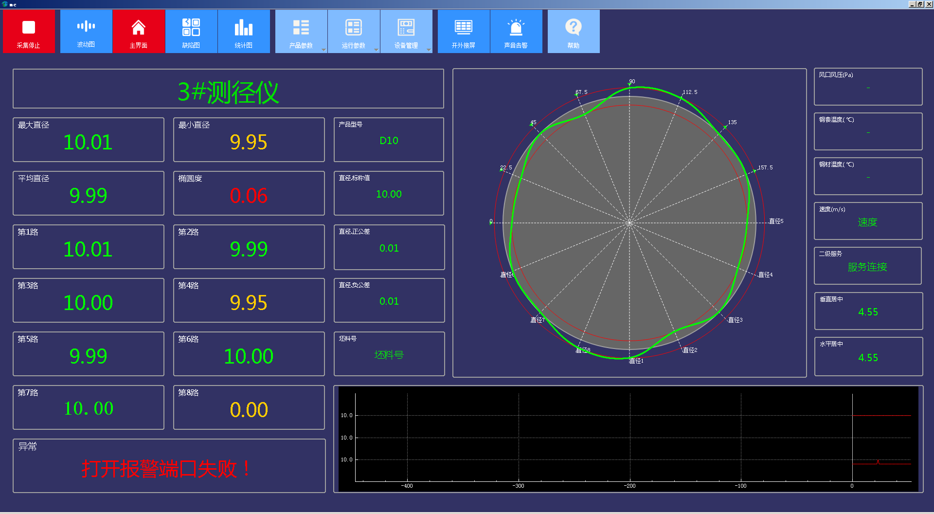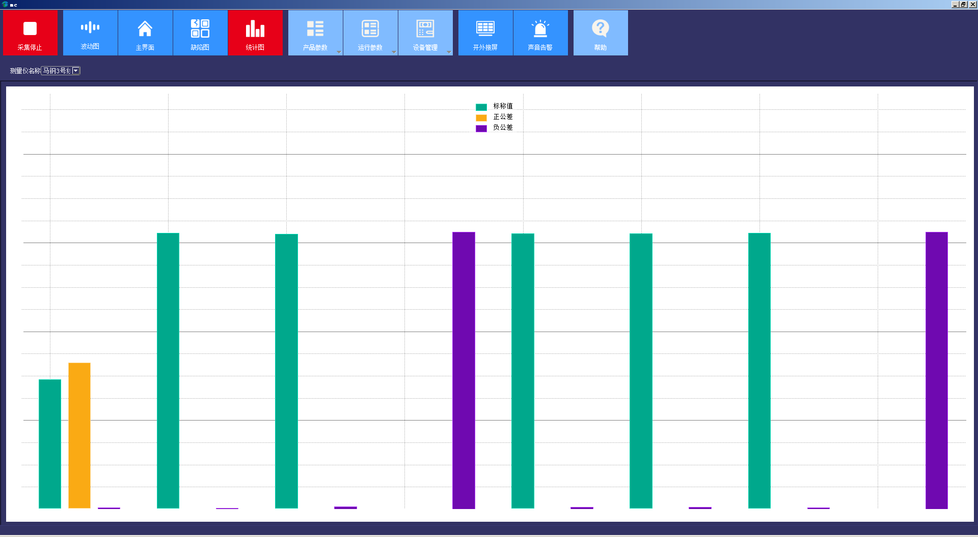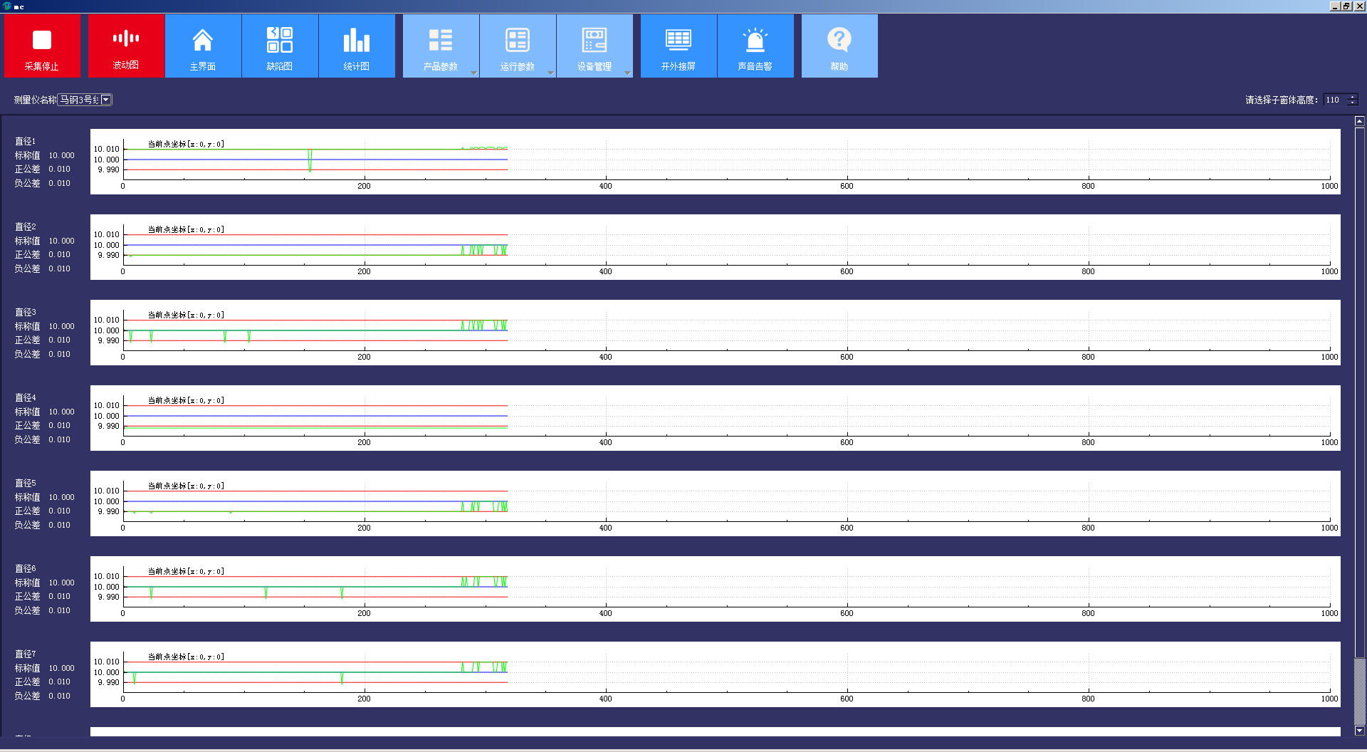 包括工具欄菜單,及主界面、波動圖、缺陷圖、統(tǒng)計圖四個數(shù)據(jù)顯示窗口。